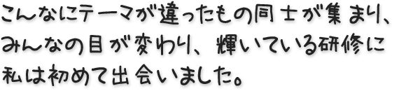 新しく参加された方も当日にスイッチが入り、ほとんどの方が、研修当日または翌日には学びを行動に変え、自発的に行動されていました。 そして地元に帰り、具体的に何を取り組むかまでこれは全員はっきりと明確に語っていました。 こんなにテーマが違ったもの同士が集まり、みんなの目が変わり、輝いている研修に私は初めて出会いました。